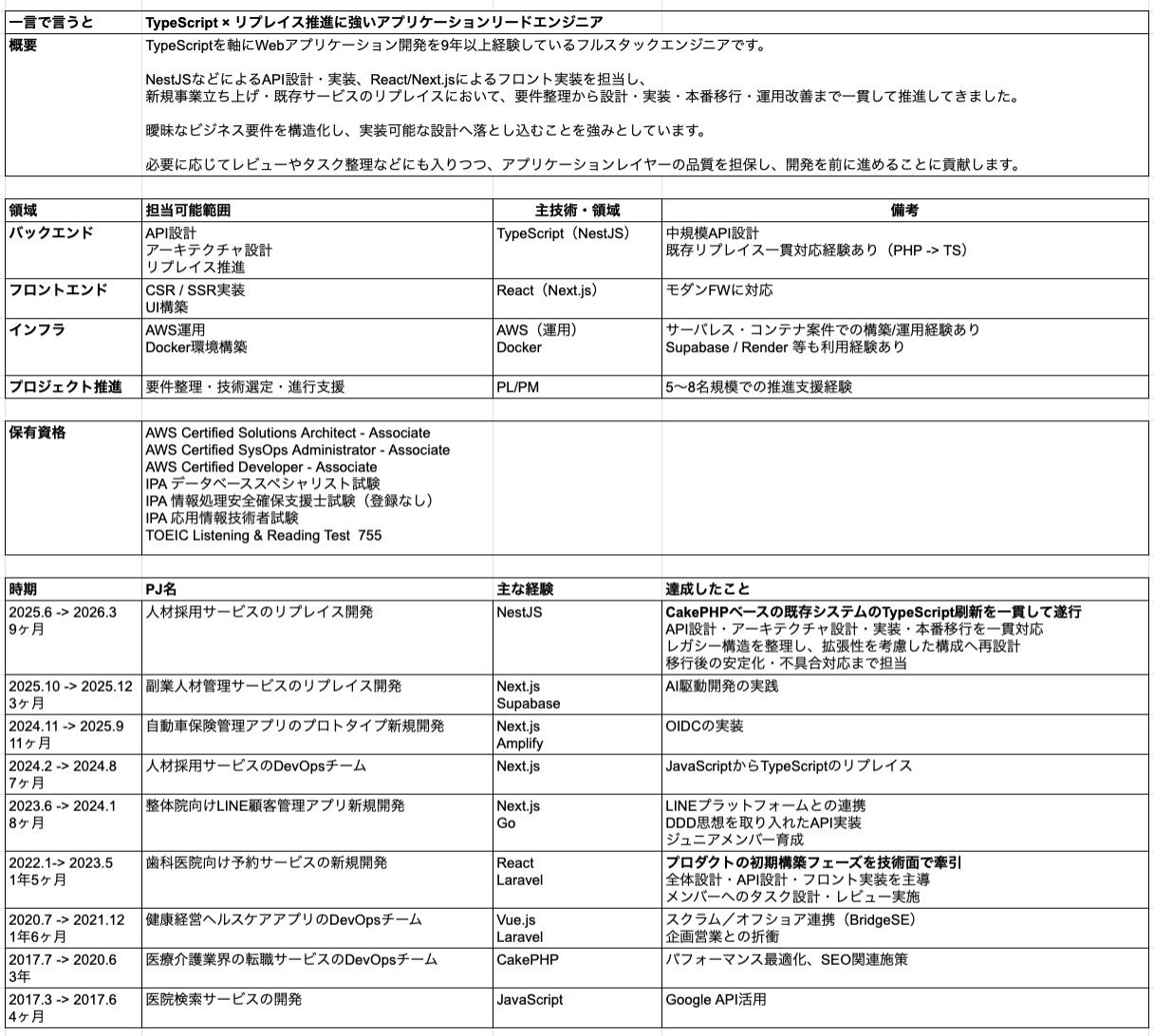 TypeScript を主軸に、Web アプリケーションの設計・実装・運用まで担当するフリーランスITエンジニアです。 API 設計、フロントエンド実装、AWS 運用、既存システム刷新のような「全体を前に進める」役割に強みがあります。